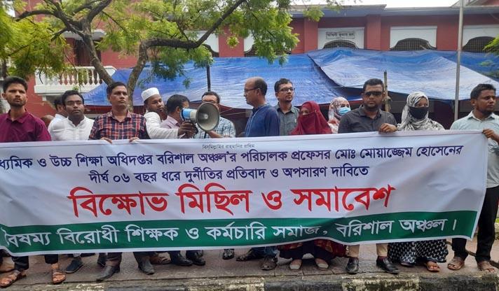 এমপিও হওয়া কলেজের শিক্ষকদের এমপিও আবেদন আটকে দেয়া, হয়রানী এবং উৎকোচ চাওয়ার অভিযোগে মাধ্যমিক ও উচ্চশিক্ষা অধিদপ্তর (মাউশি) বরিশাল আঞ্চলিক পরিচালক প্রফেসর ড. মো. মোয়াজ্জেম হোসেনের অপসারনের দাবী উঠেছে। এ দাবীতে বুধবার বিক্ষোভ করেছেন শিক্ষক-কর্মচারীরা। বেলা ১১টায় নগরীর অশি^নী কুমার টাউন হলে বৈষম্য বিরোধী শিক্ষক ও কর্মচারী সমাজ, বরিশাল অঞ্চলের উদ্যোগে এ সমাবেশ অনুষ্ঠিত হয়। পরে পরিচালক মোয়াজ্জেমের কার্যালয় ঘেরাও করেন শিক্ষকরা। অভিযোগ উঠেছে, বিভাগের শতাধিক শিক্ষক- কর্মচারীর এমপিও মাউশি পরিচালকের খামখেয়ালীতে দেড় বছর ধরে আটকে আছে।